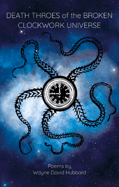 I spent some time browsing the poetry section of NetGalley on my break this morning. I know we’re not supposed to judge books by their covers, but I admit I am more likely to click a title with interesting titles and cover art. Death Throes of the Broken Clockwork Universe, by Wayne David Hubbard has both of these elements.