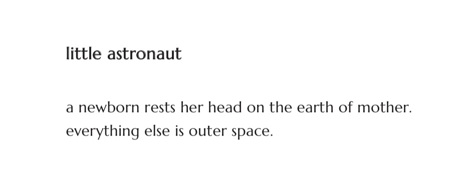The space theme gives it a fresh feel. There are space metaphors sprinkled throughout that sort of tie the whole thing together. Yes, it’s a new mom venting about the usual new mom experiences. Some of the poems blend together, a result of their sameness. There is some repetition, but it flows from one space metaphor to another on the inertia from the strong prologue and titular poem.